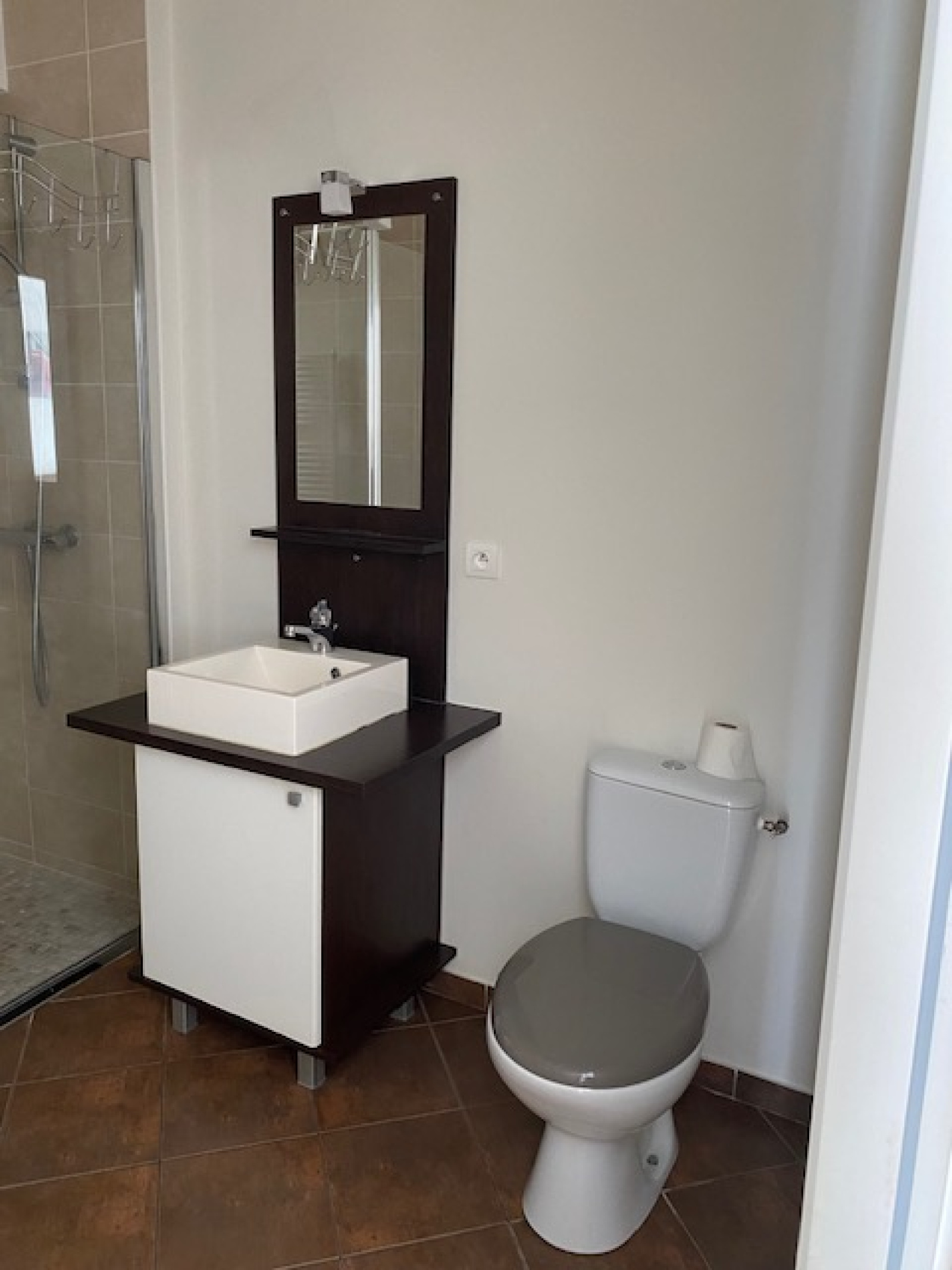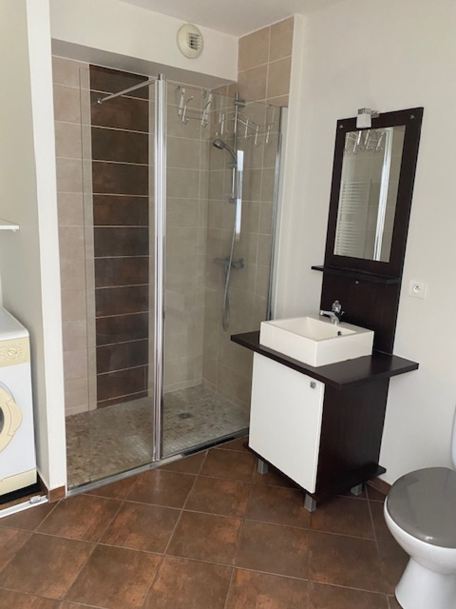 lave linge, meuble vasque avec miroir, douche à l'italienne