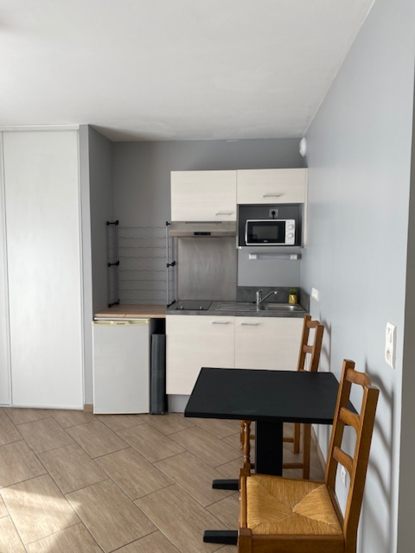Kitchenette avec hotte placards haut et bas, frigo top, micro-onde, plaque induction.