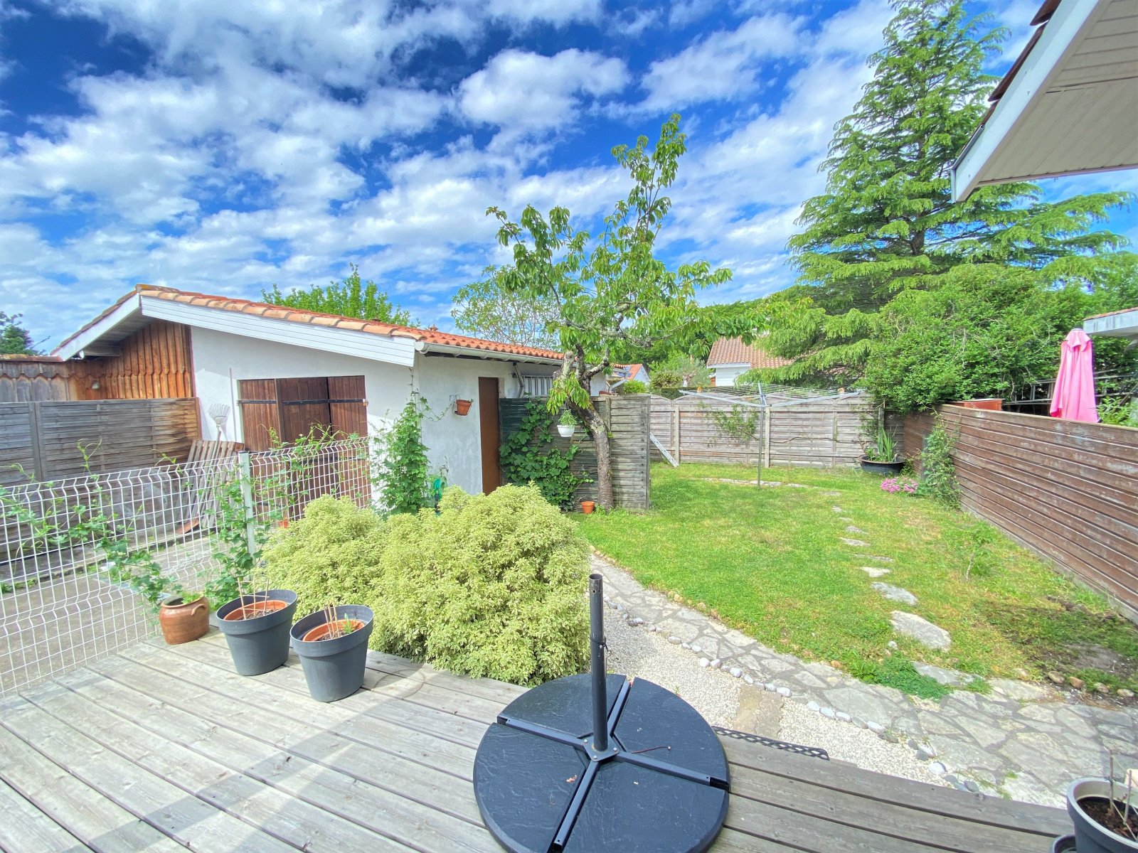 Une belle terrasse de 50 m² avec sa pergola bio climatique, un jardinet et un garage indépendat.
